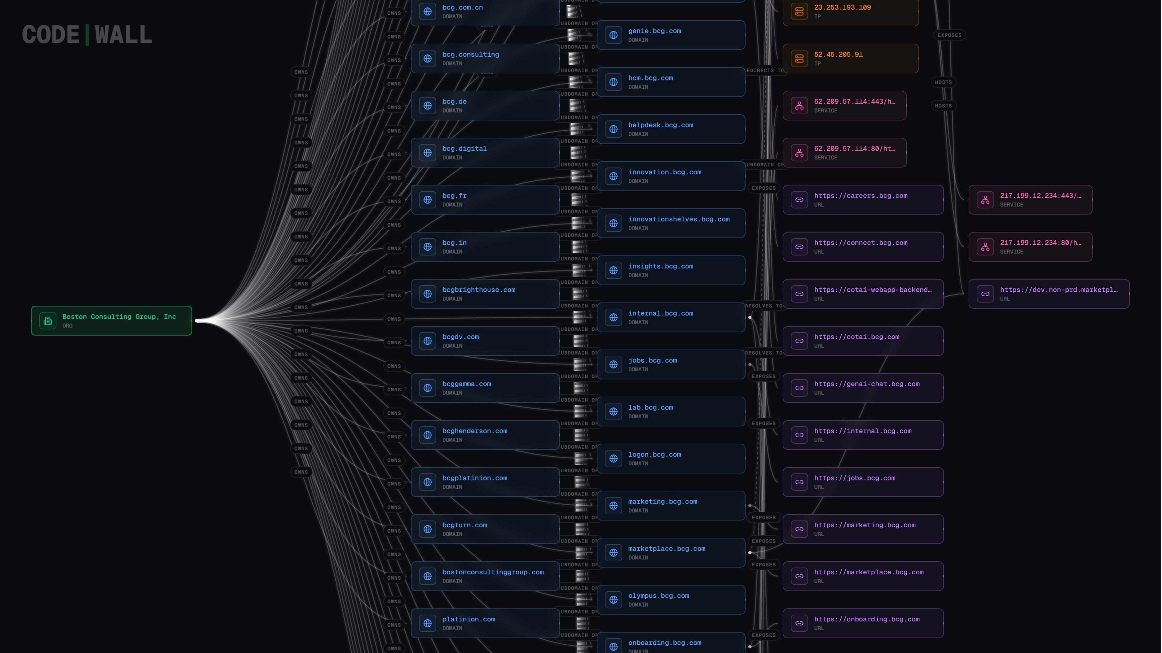 Using only the name "Boston Consulting Group, Inc", the agent ran deep reconnaissance against BCG's external IT infrastructure, pulling back thousands of subdomains, API endpoints, and application services. Most resolved to login pages or locked-down portals.